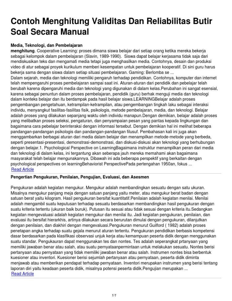 Intinya anda jangan terjebak pada pemahaman kalau pakai soal ini rumusnya ini, melainkan harusnya jika data dari soal seperti ini, ujinya pakai ini. Jadi postingan ini tidak ada lagi materi. Analisis butir soal uraian 1. Kebanyakan uji validitas digunakan bagi soal dengan jawaban tertutup. Langkah langkah menghitung validitas soal pilihan ganda dengan excel karyatulisku. Instrumen penelitian adalah alat yang digunakan untuk mengumpulkan data. Selanjutnya dikatakan bahwa untuk menghitung koefisien validitas internal untuk skor butir politomi digunakan korelasi product moment r dengan rumus. Pada kesempatan ini kita akan membahas uji validitas butir soal pilihan ganda dan essay berikut ini adalah uji validitas soal. Langkah langkah menghitung validitas soal pilihan ganda dengan excel karyatulisku. Wikipedia pendidikan download aplikasi excel pembuatan soal ujian. Sebuah instumen dikatakan valid apa bila dapat digunakan tepat untuk memperoleh data yang diinginkan. Dengan melakukan analisis butir soal pilihan ganda menggunakan ms. Pada kolom paling kanan, terlebih dahulu kita jumlahkan total skor dari tiap responden menggunakan fungsi/rumus yang ada di excel, menggunakan perintah =sum (seluruh kolom cell yang akan dijumlahkan).